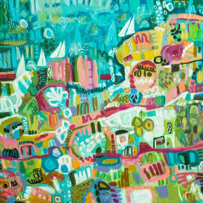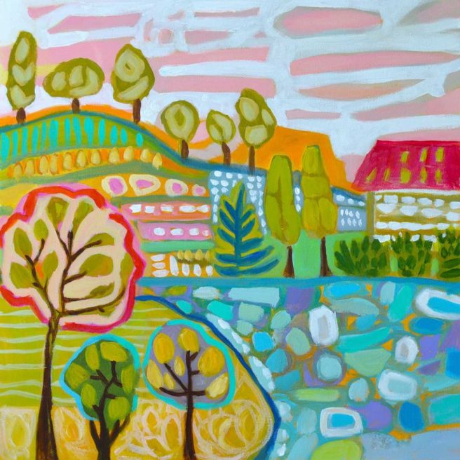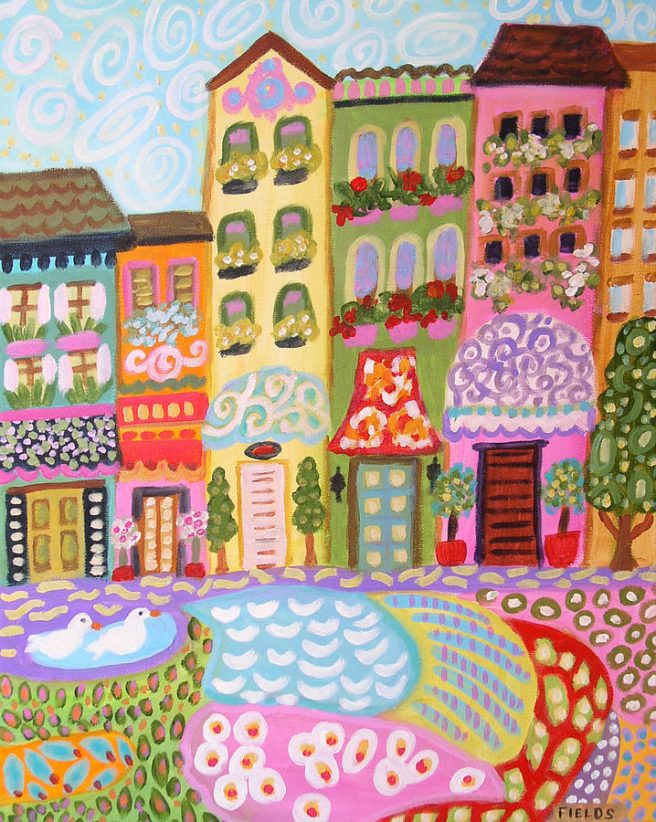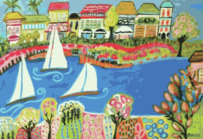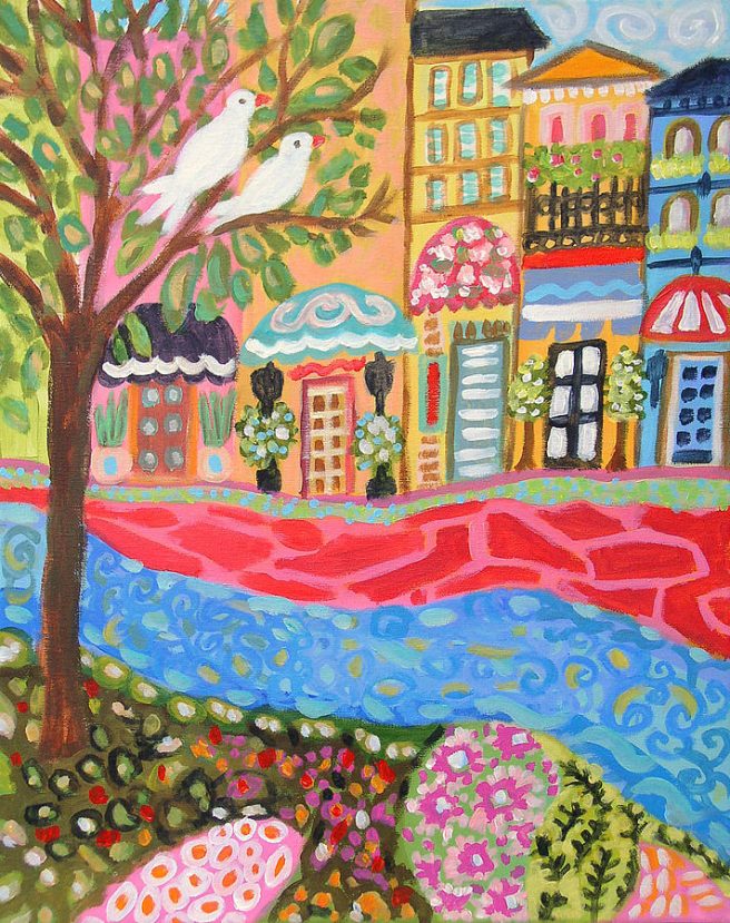 Love her cheery florals, whimsical doggies, quaint rows of shops, and picturesque sailboats on the water. Even before I knew where she was from, I sensed it could be a place like Florida — so many of her paintings make me feel as though I’m on vacation. Relax! And those dogs look like they’re having so much fun. 🙂