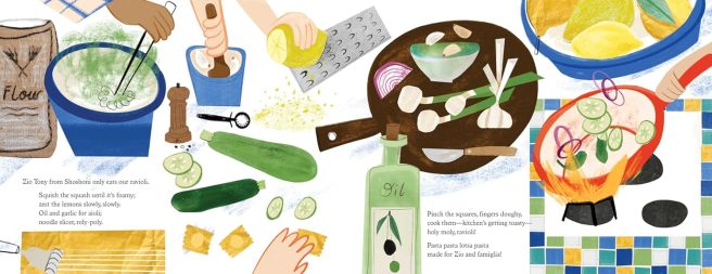 Demirağ’s compositions and use of scale are a feast for the eyes; she’s an artist with a refreshing style who loves shapes, textures, and juxtaposing elements in innovative ways. I also like how she portrayed all the characters with their distinctive facial features, hairstyles, skin tones, and expressions. It takes all kinds to make a family who likes all kinds of pasta!