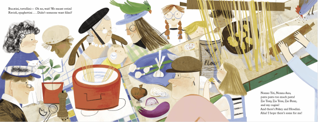A fun and delicious book, a lively read aloud. I liked learning about some pasta shapes that were new to me.