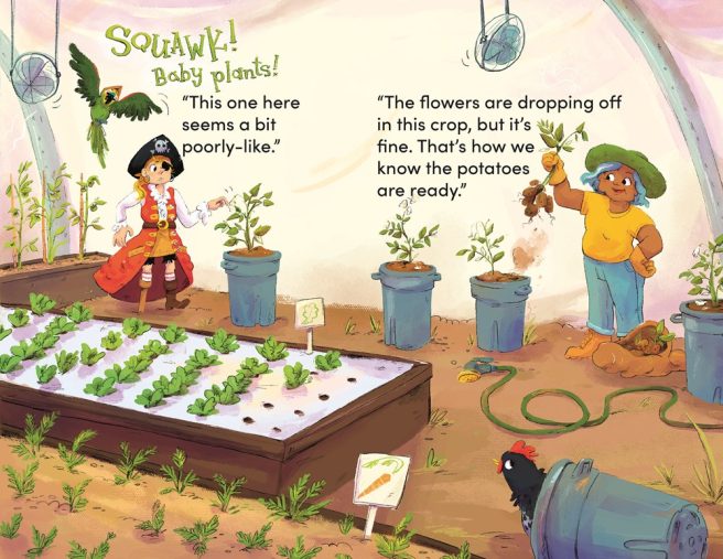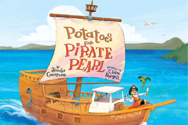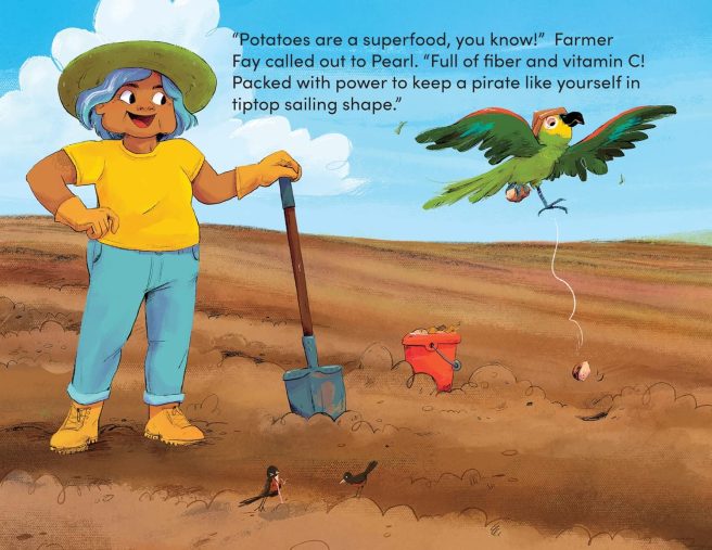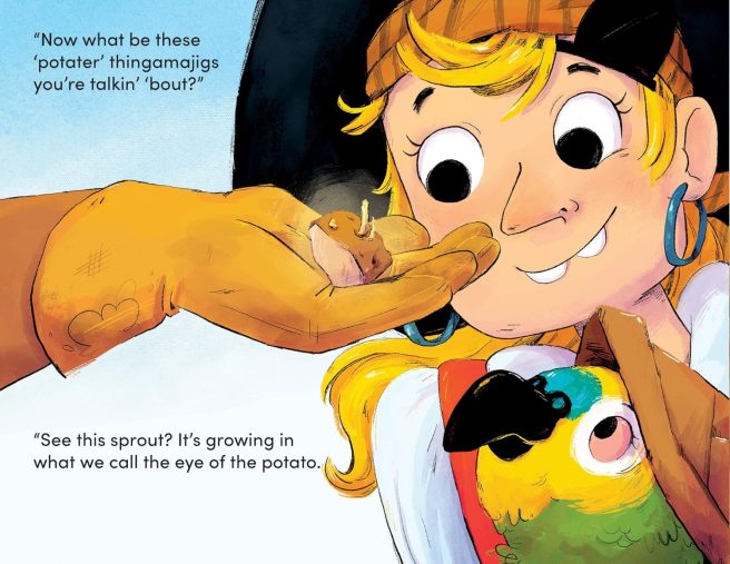 In the rib-tickling read-aloud, Potatoes for Pirate Pearl by Jennifer Concepcion and Chloe Burgett (Feeding Minds Press, 2023), a hungry pirate and her squawky sidekick learn how to plant, grow, and harvest potatoes, all while making a new friend.