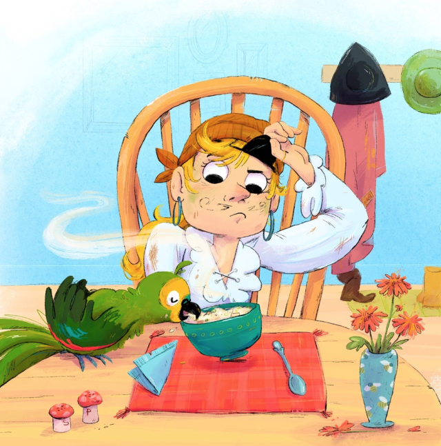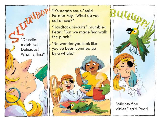 Burgett’s cartoony digital illustrations ramp up the humor with hilarious details. It appears Pearl’s “playin’ pirate” to some extent, as her eye patch actually hides a good eye, and her twirly mustache is drawn on her face (love when it gets wiped off with her napkin after eating soup). She inks it back on before leaving, though. 😀