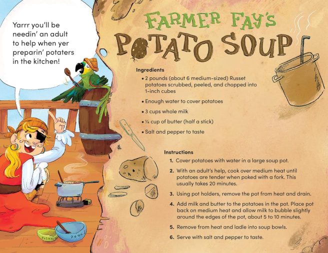 This got Pearl to thinking . . . could she grow potatoes in barrels on her boat? Aye, fer sure!! Fay explained how potatoes could be eaten in many different ways: boiled, fried, diced, smashed, hot, and cold — then enlisted Pearl to help her prepare one spudtacular supper.