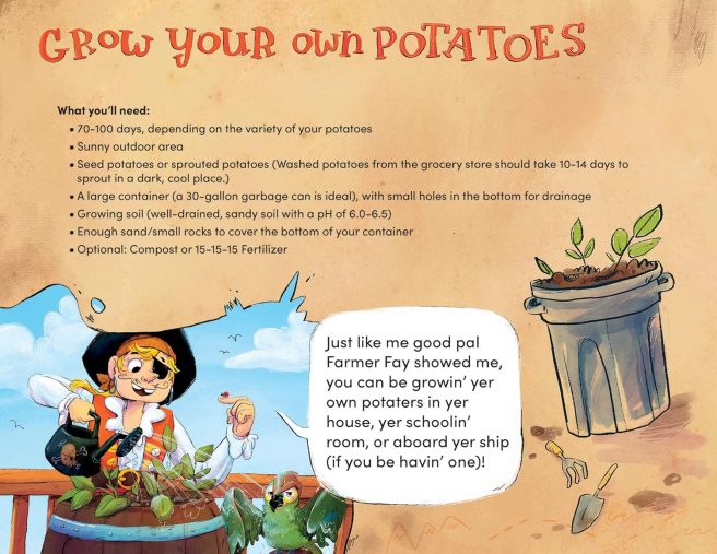 Pearl surely appreciated the “mighty fine vittles” and wanted to know more about those “potater thingamajigs.” Fay showed Pearl a potato sprout and invited Pearl to help her plant a new crop. As Pearl used her peg leg to make holes in the dirt, Fay touted the health benefits of those terrific tubers.