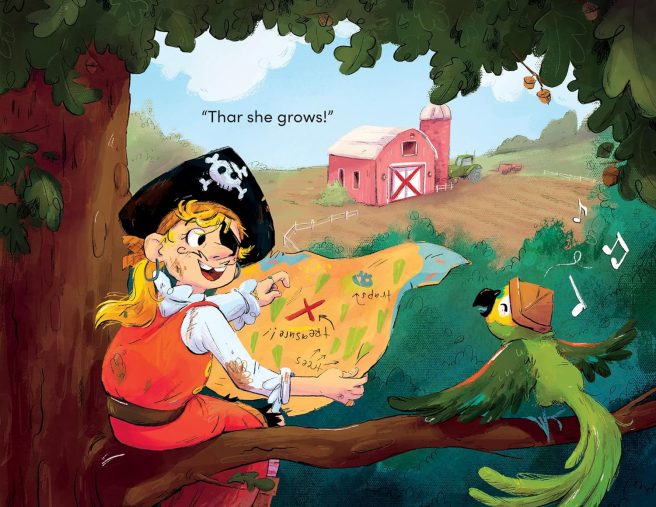 Emotive facial expressions add appeal and relatability to the characters: Pearl’s melodramatic ‘starvation’ pose, Farmer Fay’s blissful confidence, Pearl’s suspicion over the possibly poisoned soup, Pearl’s wide-eyed astonishment at seeing a potato sprout for the first time. Each page turn is a delight as Burgett alternates between full-bleed spreads, cartoon panels, and scroll-treasure map insets, for a jolly good reading experience.