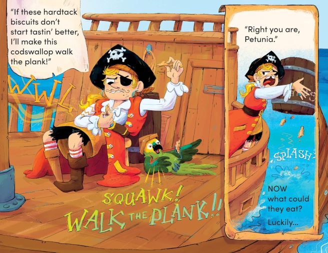 Pearl and Petunia, who had been at sea for many months aboard the Jolly Oyster, were absolutely fed up with eating hardtack biscuits day after day. “I’ll make this codswallop walk the plank!,” Pearl said, just before she tossed their barrel of grub overboard.