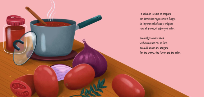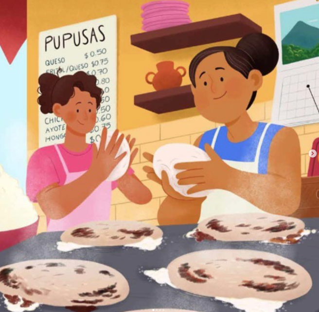 Gabriela Morán’s colorful and cheery digital illustrations dance across the pages, capturing the energy and enthusiasm of hungry pupusa makers and eaters. Pictures of fresh cabbage, tomatoes, carrots, onions and stacks of pupusas being cooked and shared with others will certainly make readers curious to try them if they haven’t already done so.