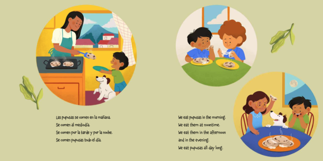 As the story opens, our friendly narrator explains that pupusas are a very popular, magical food in El Salvador, where it’s eaten morning, noon, and night. Pupusas are made from corn or rice flour, were once cooked in clay griddles, but are now made on big metal grills. And they’re round!