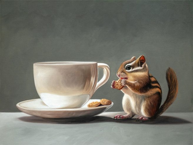 Like how she blends realism with a touch of whimsy. Sometimes still lifes can feel staid, even boring — but Lauren’s pieces have that wonderful element of the unexpected, thanks to charming compositions and a meticulous attention to detail. Her primary themes are animals, landscapes, food, objects, botanical and whimsical.