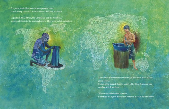 But now I must confess something. Until I read BLUE: A History of the Color as Deep as the Sea and as Wide as the Sky by Nana Ekua Brew-Hammond and Daniel Minter (Knopf BFYR, 2022), I knew very little about blue’s fascinating history, origins, and cultural significance. Imagine my surprise when this book magically appeared in my mailbox one day — simply out of the blue (thanks for the gift, Miss T.)! 🙂