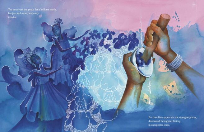 The book’s first spread shows three children floating upwards, reaching for the sky, and in the final spread, they are joined by a giant pair of blue arms, perhaps symbolizing how blue, with its “complicated history of pain, wealth, invention, and recovery” has become a symbol of possibility, “as vast and deep as the bluest sea, and as wide open and high as the bluest sky.”
