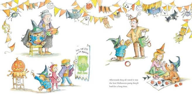 I love how Alley’s visual narrative complements and extends Bond’s story, providing a rich context for all the action and injecting energy into every scene. There’s a lot going on in each of the spreads, much that kids can relate to and learn from. What are each of the Browns eating for breakfast? What kind of costumes are Jonathan and Judy making? Look at how great the house looks festooned with little ghosts, giant spiders, bats and oh-so-British bunting!