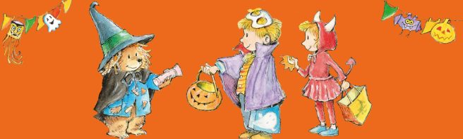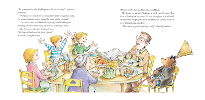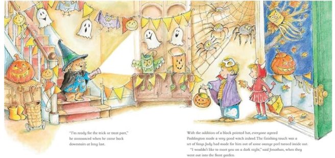 It all started Halloween morning, when Paddington came downstairs to breakfast carrying Mrs Bird’s best broom and wearing a trash bag draped over his duffle coat. He was working on his costume, since Jonathan and Judy had promised to take him trick-or-treating. Judy suggested they have a party afterwards, to which Paddington heartily agreed, as he’d never been to a Halloween party before.
