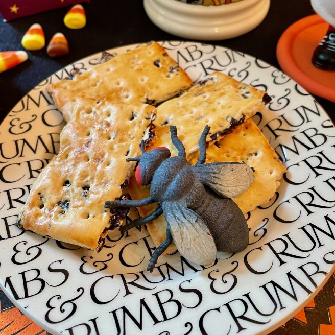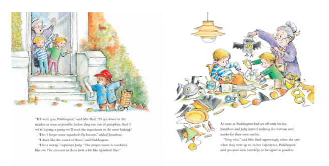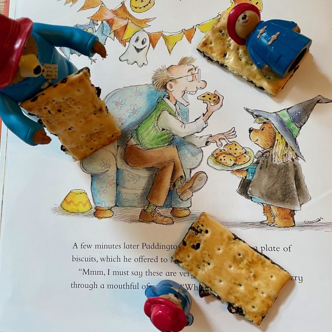 When he got back, Paddington helped Mrs Bird bake “squashed-fly” (Garibaldi) biscuits, since he couldn’t find any at the market, while Mrs Brown hollowed out pumpkins for lanterns.
