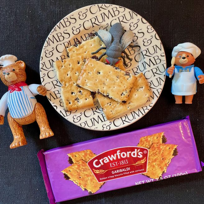 Garibaldis are still widely available in the UK, produced by such brands as Crawford’s, M&S, and Tesco. The 70-something Paddingtons and I were happy to taste test the Crawford’s ones: the biscuit was a bit crumblier than what I remembered and there was less fruit filling. Makes sense — raisins are bigger and juicier than currants. Still, lovely with a cup of tea! 🙂