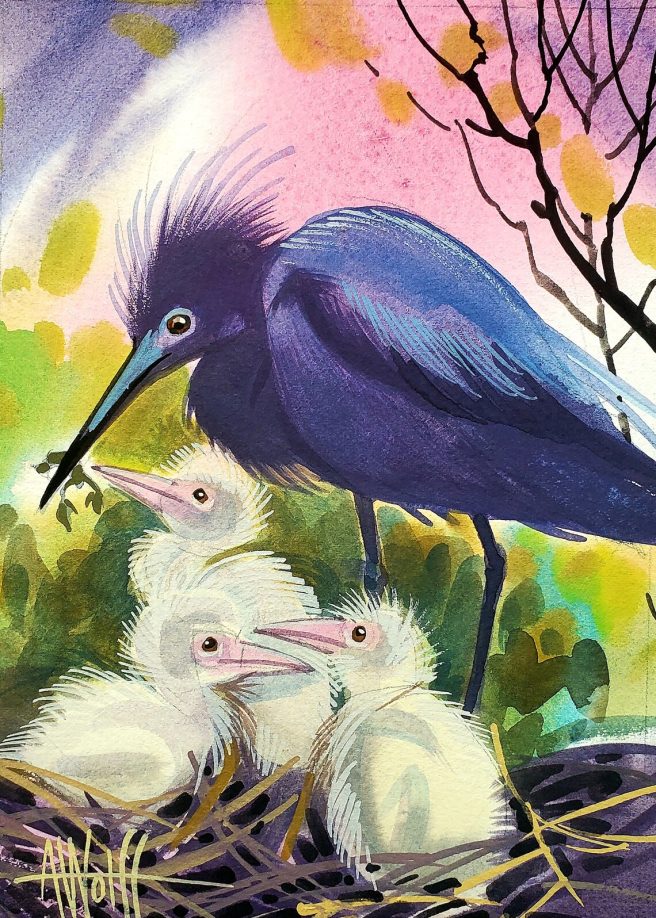 “Little Blue Heron” by Ashley Wolff (gouache on paper, 2022).