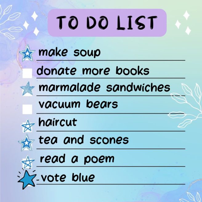 I’m an inveterate list-maker. I’ve made a list of everything I intend to do on Tuesday. First up is work the polls all day, but when I get home, I am going to bear witness to the news (in small doses) as I write, read, paint, stitch, and bake my way to (hoping hoping hoping) our new BLUE future.