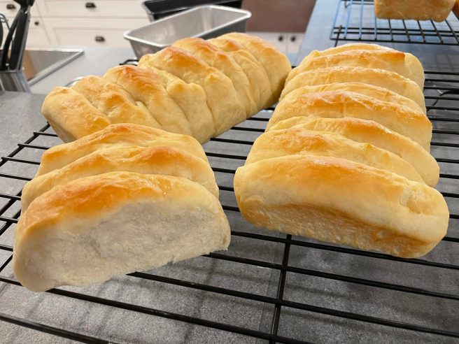 The toasty smell of the rolls baking brings the rest of the family to the kitchen. When the bread is finally done, they butter the tops and turn them out of their pans before eating them with butter, honey, jam and laughter.
