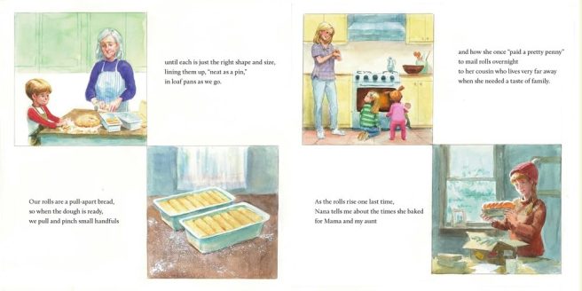 The loving bond between grandmother and grandchild is palpable whether we see them working together in the kitchen or relaxing in Nana’s green armchair. Scenes of children from other cultures learning to make bread speak to the universal rewards of baking something from scratch and the significance of this staple in the world’s larger family.