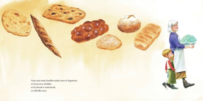 While waiting for the dough to rise a second time, Nana and Little Pickle talk about the different kinds of bread others make (naan, baguettes, focaccia, challah). Most require the same simple ingredients, “for times they can be together, and times they can’t.”