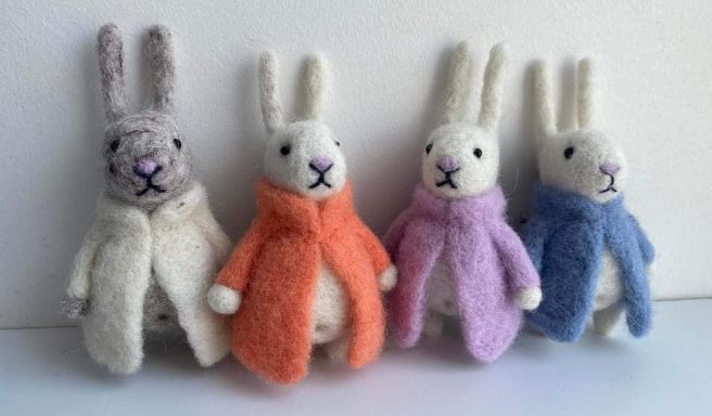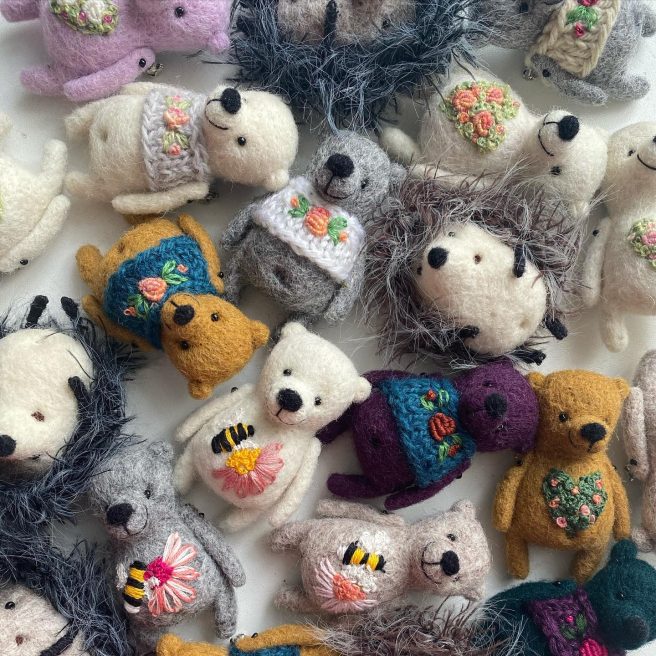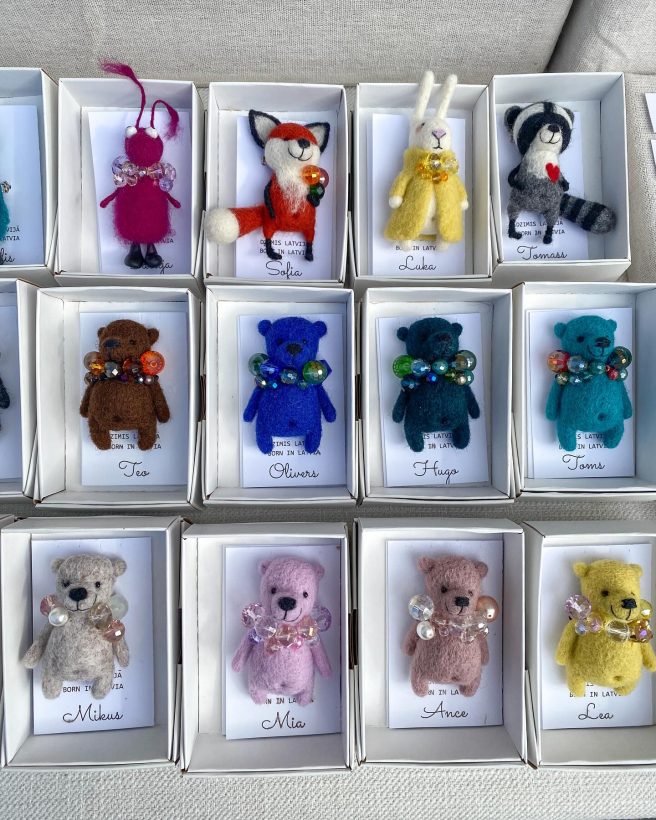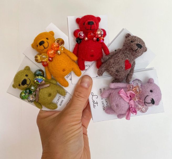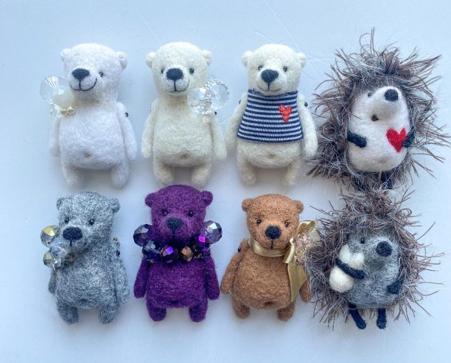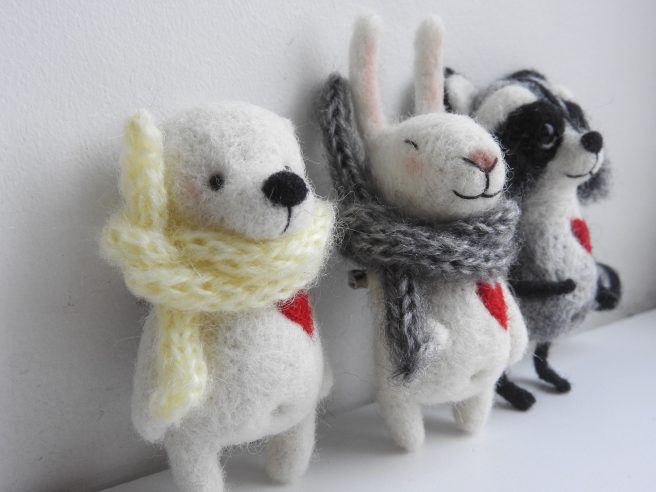 Each piece is handmade from 100% needle felted, eco friendly wool and is about 3 inches high. They come with their own passports specifying name, size, color, and favorite snack. You can also personalize them. Cute to wear on your lapel, bag or hat. 🙂