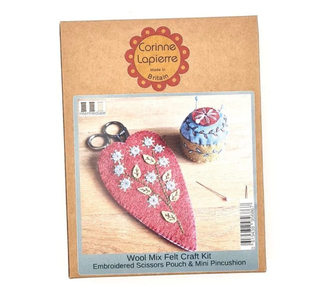 Everything you need to complete this practical and beautiful embroidered scissors pouch and cute mini pincushion is in the box, including high quality super soft wool mix felt as well as 12 carefully chosen assorted DMC threads, a needle and toy filling.