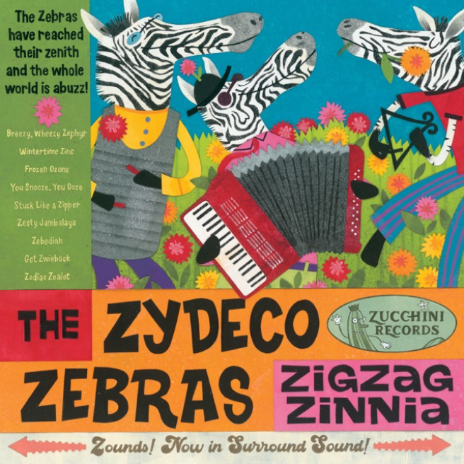 Wait, there’s even more. Back matter includes hilarious About the Artists career notes as well as charming Acknowledgements. In addition to older picture book readers, Animal Albums from A to Z holds appeal for adult record collectors, graphic design enthusiasts, and wobbly baby boomers who enjoy witty riffs on their fave musicians (especially since vinyl records have been making a comeback).