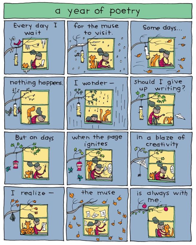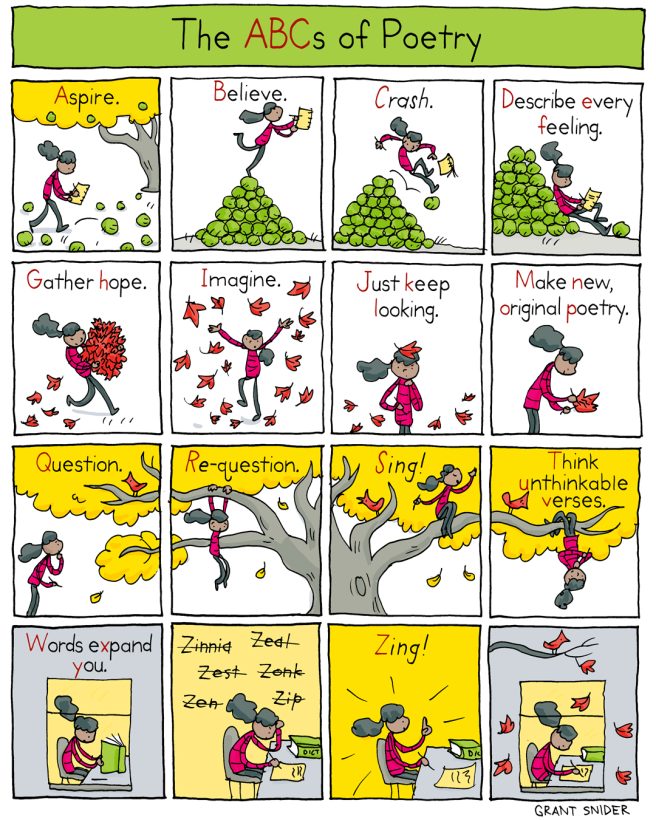 8. Jama, thank you for highlighting Grant Snider here. What a lovely collection of his work. I follow him on Instagram, and I always love reading his poetry comics. I haven’t got his book yet, but now I want it all the more!