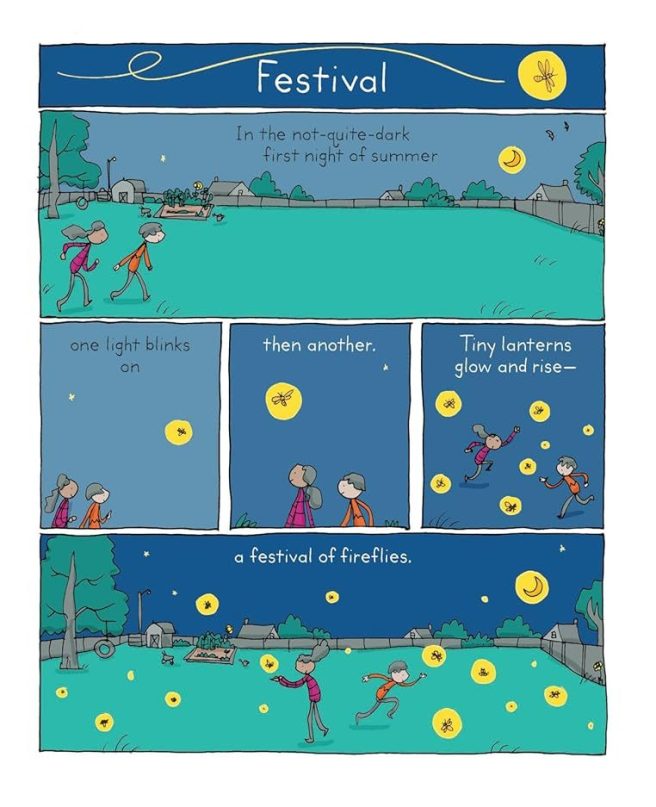 Kids will feel heard, reassured, amused and energized. I love the sense of self empowerment and the open-hearted invitation to play, explore, dream, imagine, and embrace the wonders of the natural world. There are poems about building confidence, recognizing the value of practice and persistence, and having the courage to step outside one’s comfort zone. And then there’s reveling in the sheer beauty of “a festival of fireflies” or comparing a night in the country to “a sparkling sea.”