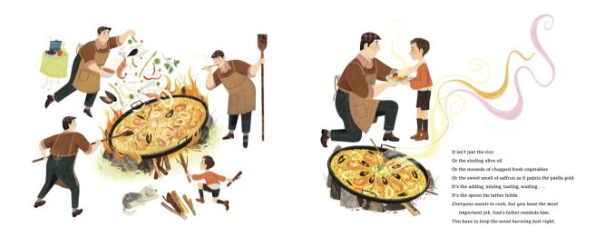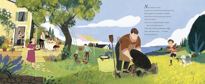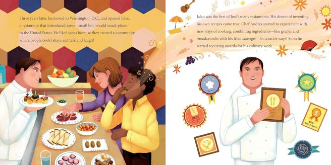 1. Erin Frankel’s lyrical, poetic text brims with mouthwatering sensory details. Important milestones in Andrés’s life are highlighted with recurring taglines in Spanish, underscoring his expansive approach to everything. There is always more — more possibilities, more places, more ways to help. The book begins with No es solo arroz (“A paella is so much more than just rice”), continuing with ‘more’ than just a boat, a restaurant, a trip, more than just a dream. Andrés views life as full of opportunities to learn, reach out, and impact ever-widening, diverse groups around the world.