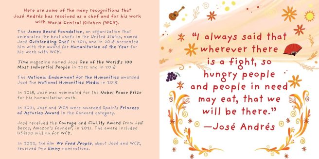 5. Backmatter includes an interesting Author’s Note as well as a Selected Bibliography for further study. Frankel mentions Andrés is also a bestselling author, TV personality, and proud father, and that he and his wife Patricia hatched the idea of WCK together.