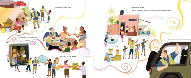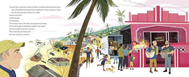 4. Marta Álvarez Miguéns’s vibrant illustrations are packed with affecting details showing José’s interactions with family, friends, fellow culinary workers, customers, traveling companions, and local residents. The sense of joy and community shines through despite tragic circumstances, and readers will get a better sense of what disaster relief workers do. “Whenever José Andrés goes to a new place where people are hungry, he gets motivated because he remembers his father wearing a white apron and cooking paella. José can see his neighbors, young and old, eating, laughing, and even dancing.”