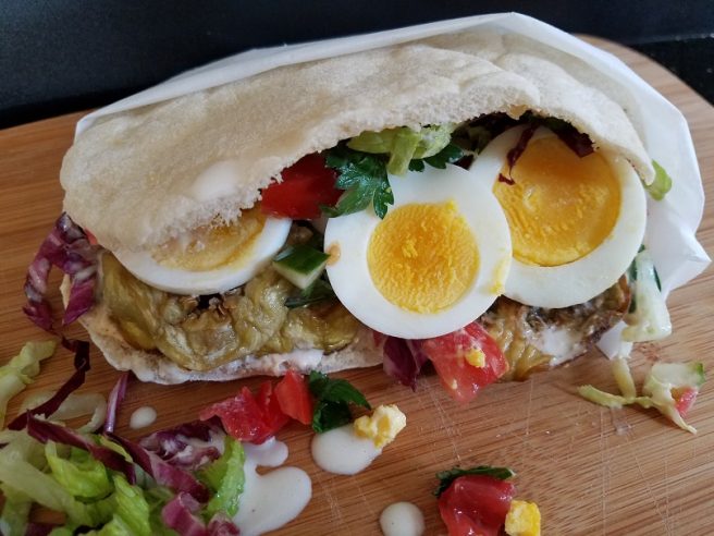 After reading “stuffed the browned slices into pita bread with cheese or eggs, tomatoes or hummus,” my mouth really began to water, so I googled “fried eggplant + pita bread,” and discovered sabich, an Israeli pita bread sandwich stuffed with all the things the poem mentions plus more. It’s a beloved street food all over the country.