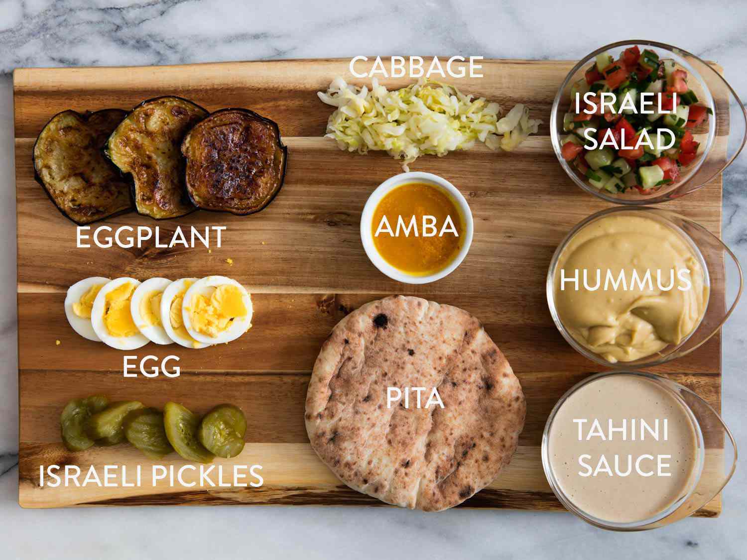 This makes perfect sense since Levy lived in Israel for 16 years. There are many sabich recipes online with variations, though I sense fluffy (rather than flat/cardboard-y) pita bread is essential, along with the eggplant, Israeli chopped salad, hard-boiled eggs, parsley, and traditional condiments: hummus, tahini, amba (pickled mango sauce). Some people also like to add boiled potatoes, chopped onion, shredded cabbage, Israeli pickles and zhug (green hot sauce).