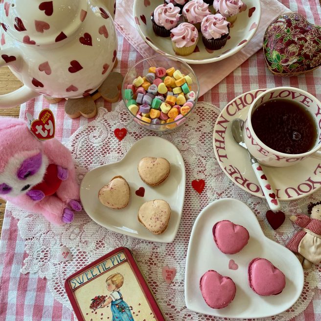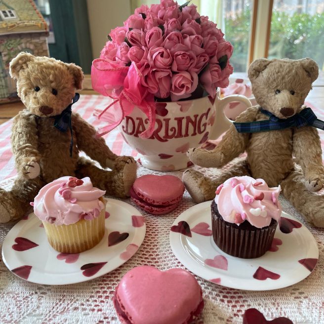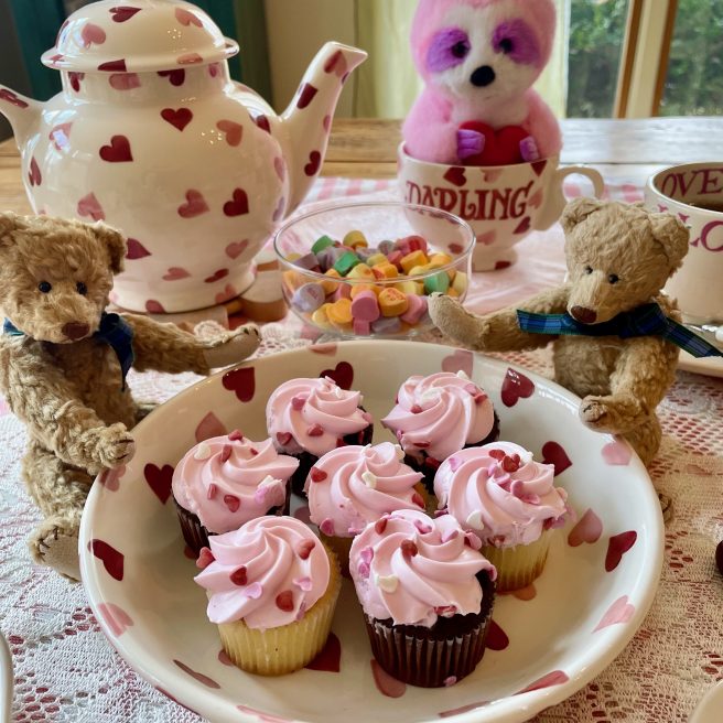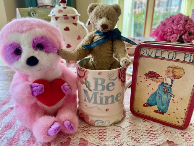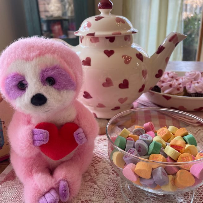 Wow, Jama, Happy Valentine’s Day and happy 47th anniversary to Len and you! 🙂 Yes, I think your pink sloth Tart is cute! I have a special place in my heart for sloths because they move in slow motion taking their time to smell and enjoy everything. Plus, I think they’re cute in real life, too. Thank you for sharing this poetry book about a long love relationship. I like the title. I resonate with the poem. My husband is the one up with the birds. I do love eggplant made in any way, but I like to make eggplant parmigiana by baking or microwaving it GF with no breadcrumbs or frying. I also love to cook eggplant in ratatouille with yellow summer squash, carrots, onions, green beans, Swiss chard or kale… in marinara sauce, yummy. I love all your heart and Be Mine China, cupcakes, macaroons, valentine decorations, and teddy bears. I’ll try a macaroon since I’m GF, but your cupcakes are beautifully decorated. Thank you for sharing your yummy post. 🙂