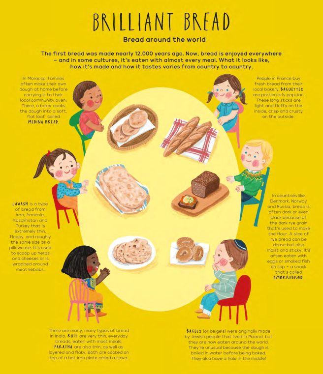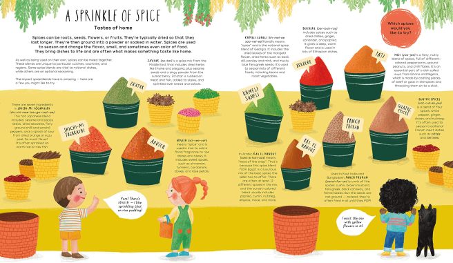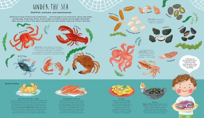 Budding linguists will appreciate the spreads showing how to say ‘delicious,’ ‘goodbye,’ ‘crunchy,’ ‘chewy,’ ‘happy eating,’ etc., in a variety of languages. Pronunciation guides for foreign dishes are also included, and food trivia buffs will have a field day with the tasty little nuggets sprinkled throughout.