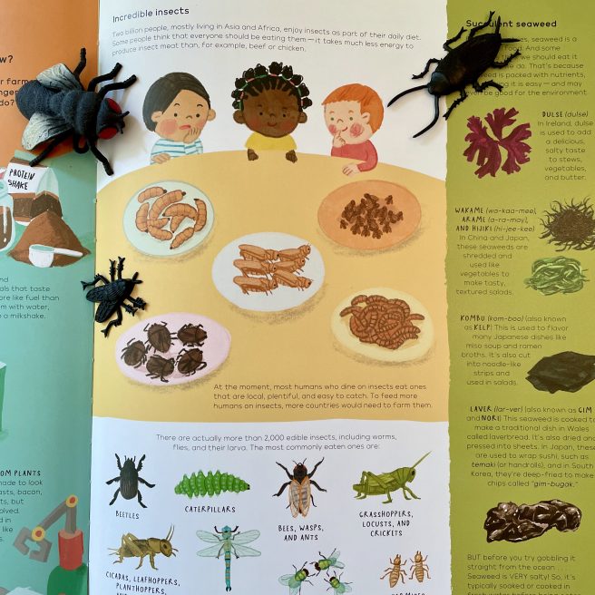 The mouthwatering menu contains 33 “courses” or topics, most featured on inventively designed, reader friendly double page spreads along with several single page spreads + sidebars. Friendly kids of multiple ethnicities are shown eating, serving, or interacting with various types of foods (interesting asides are conveyed via occasional speech bubbles).