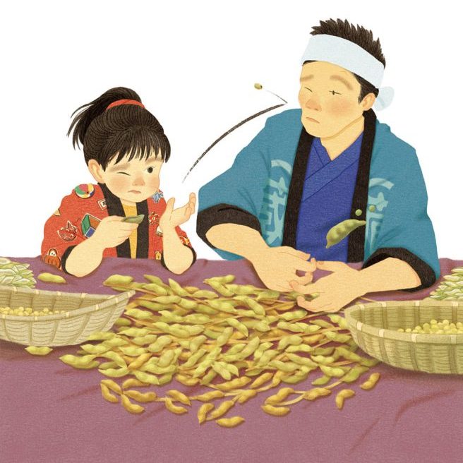 Fujisawa’s depictions of Chiyoko and Papa together are especially well drawn, showing a variety of relatable emotions through convincing facial expressions and gestures. Since their relationship is at the heart of the story, it’s wonderful to follow them from spread to spread, get a sense of their personalities, and see their reactions. I especially like the spread of them shelling soybeans, when Chiyoko squeezes a pod and the bean accidentally hits Papa’s face. Nice bit of playfulness!