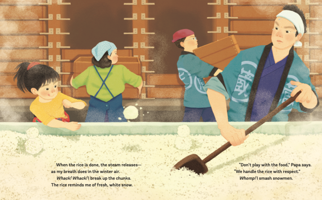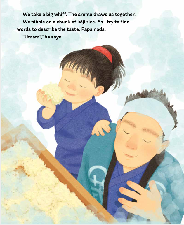 She wakens when she hears Papa walking to the misogura and follows him there to see if the rice is ready. “Not yet,” Papa says, reminding her that “magic takes time.” Papa needs to periodically turn the rice so it won’t overheat and kill the kōji.