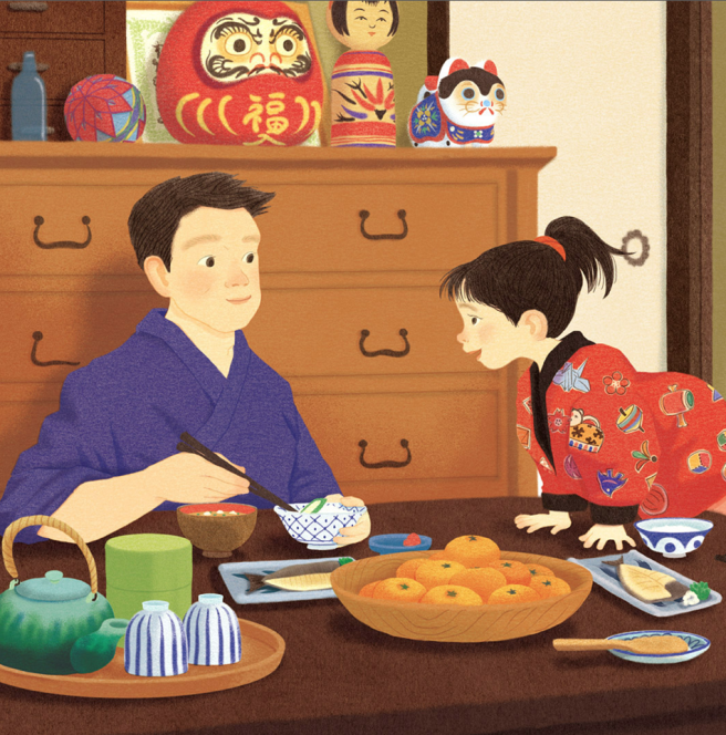 Since it reminds Chiyoko of fresh, white snow, she whacks at the rice to break up the chunks and to smash “snowmen.” Papa tells her not to play with the food: “We handle the rice with respect.” He sends her outside for a time out.
