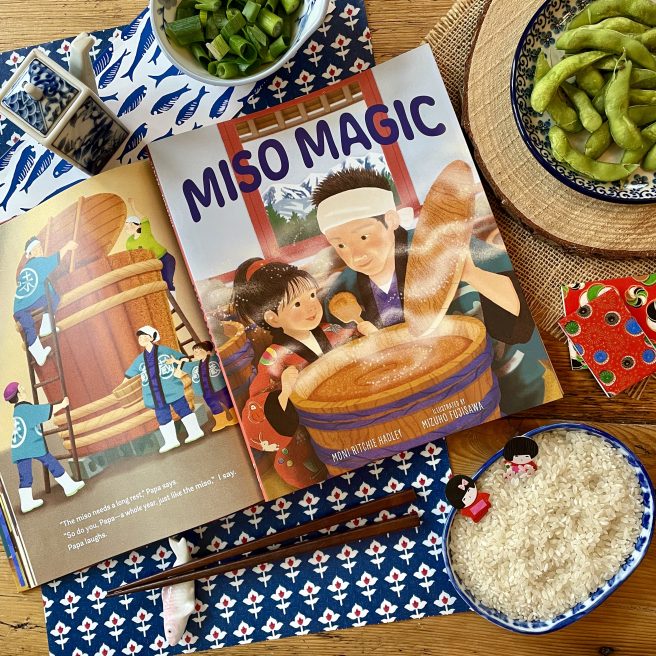 Much as I love Japanese food, I actually didn’t know how miso was made until I read Miso Magic by Moni Ritchie Hadley and Mizuho Fujisawa (Albert Whitman, 2024), a tender father-daughter story about family traditions and cultural heritage flavored with a gentle lesson in patience.