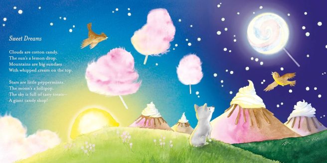 Enjoy this pair of sample poems. They’re both food-related (what better way to induce pleasant dreams and a restorative sleep?). Nothing better than a candy shop sky or learning about the phases of the moon via fruit. 🙂