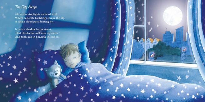 The gentle, soothing poems celebrate the breathtaking beauty of moonlight painting “worlds of wonder” upon “canvas seas,” its ability to illuminate a dark forest as “Earth’s/Head/Light”, or with “Her satin glow/Of shimmering silk,” ‘turn the lake into a saucer of milk.’ Both companion and comfort, the moon is nighttime’s star attraction, watching over all of us no matter where we are.