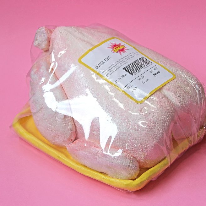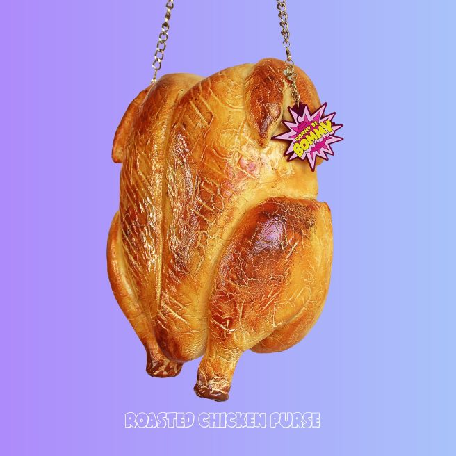 She seems to have a thing for dropped, broken, partially eaten or spilled food, too. This element of the unexpected keeps you smiling. After all, life isn’t perfect, now is it? Still appetizing, still tasty. Speaking of having a sense of humor — she not only has a roasted chicken purse, but a raw one too, wrapped in its supermarket finery. Chickens are always funny. And where would you be able to find a smashed pumpkin bag? Come on! 😀