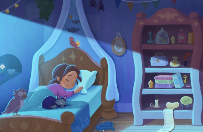 The last thing she does is conjure up a little sweet-dream magic before cuddling in bed with her mom. As she drifts off to sleep, Little Witch is happy to know she’s checked everything off her Magical To-Do List. Well done!