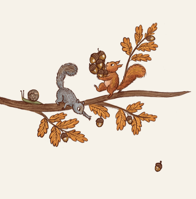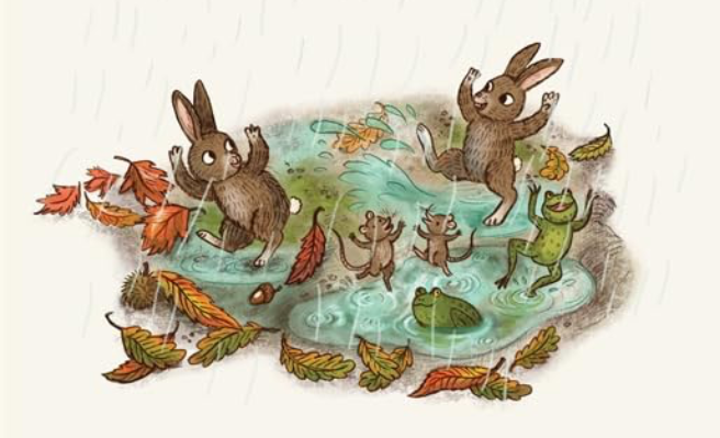 As a longtime Freya Hartas fan, I was happy to see more of her charming illustrations. Who can resist a zealous ladybird chasing aphids, a puffy-cheeked caterpillar munching on a juicy leaf, industrious squirrels gathering acorns? Kids love looking for cute details and Hartas’s lovingly drawn animals are irresistible.