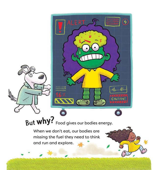 This book is such a fun way of reminding kids about the importance of healthy eating habits and making the right food choices. Pryor has included interesting Back Matter about the process of digestion and why protein, whole grains, fiber-rich fruits and veggies are quite efficient at staving off hunger pangs, and she provides suggestions for healthy snacks.