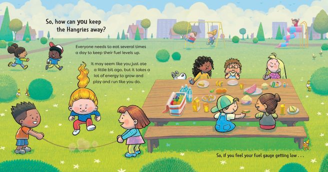 How do you keep the hangries away? Try not to skip regular meals because “it takes a lot of energy to grow and play and run like you do.” For between-meal emergencies, pack a healthy snack and you’re good to go. 🙂