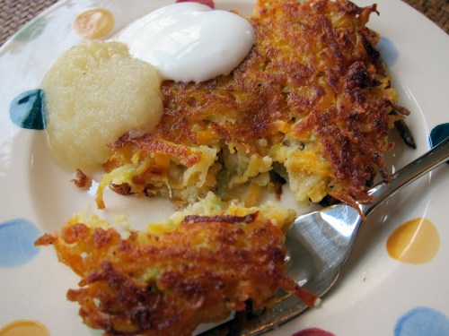 Since I really wanted to impress any grandmotherly prospects, I decided to forego the classic white potatoes recipe in favor of something a little different. Actually, I got a special request from poet friend Gail Gerwin to share the Sweet Potato-Apple Latkes recipe from