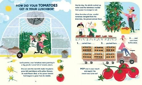 Maybe it wasn’t the food itself, but his curiosity about how it got there. In How Did That Get in My Lunchbox?: The Story of Food by Chris Butterworth and Lucia Gaggiotti (Candlewick, 2011), we learn the interesting backstories of typical lunch ingredients (bread, cheese, apples, clementines, apple juice, carrots, tomatoes, and the chocolate in chocolate chip cookies). Most of us take our food for granted as it magically appears on supermarket shelves. Unless children have grown up on a farm or visited an orchard or cheese factory, they might not realize that quite a few people have had a hand in producing some of the things we eat every day.