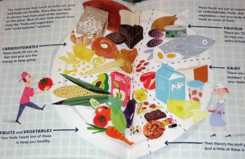 Cheery illustrations provide fascinating details (trucks, machines, animals, workers, production lines, farms, fields, orchards) which help to clarify tasks. There’s also a chart of the four basic food groups with advice on the importance of drinking adequate water, eating a variety of fruits and veggies, and getting enough exercise.